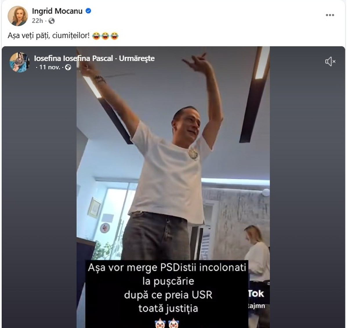 Avocata propagandistă Ingrid Mocanu are însă o istorie politico-penală mult mai complicată decât amintește activista Angi Șerban în postarea sa, ea fiind la un moment dat inclusiv consiliera controversatului Gabriel Oprea, sinistrul general din cauza căruia a murit un tânăr polițist, dar și angajata Ministerului Justiției care și-a lăsat baltă munca la minister pentru a da o fugă până în Bulgaria și a împiedica extrădarea Elenei Udrea, infractoare eliberată recent din penitenciar ca urmare a eforturilor unei alte avocate AUR, Silvia Uscov.