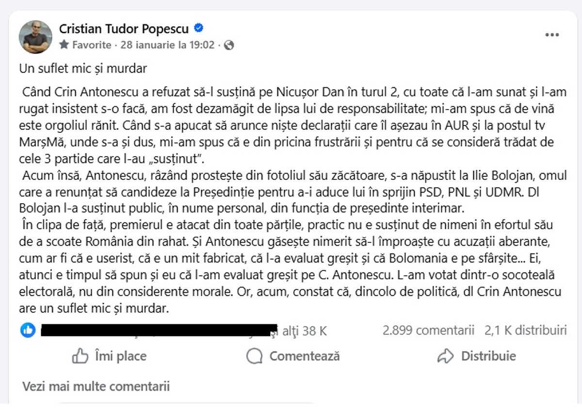„Nu voi răspunde niciunuia dintre zecile de întreținuti ai propagandei băsiste pe vremuri, astăzi nicușoristo-bolojeniste și așa mai departe. Eu nu am niciun fel de plăcere din astfel de polemici. Nu vreau să discut mai mult despre această dragoste pătimașă, oarbă, a domnului Popescu pentru domnul Bolojan (referire la Cristian Tudor Popescu a criticat virulent într-o postare atitudinea lui Antonescu din prezent, reamintindu-i că Bolojan a renunțat să mai candideze la președinție pentru a-l susține pe el, n.red.).