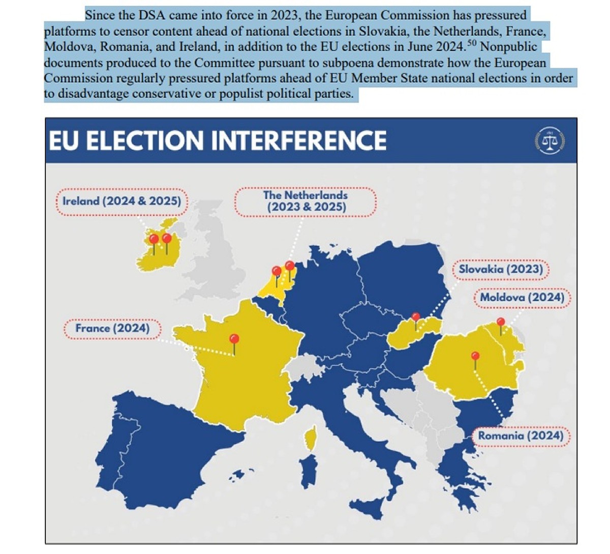 De la intrarea în vigoare a Legii privind serviciile digitale (DSA* - detalii explicative mai jos!) în 2023, Comisia Europeană a exercitat presiuni asupra platformelor pentru a cenzura conținutul înaintea alegerilor naționale din Slovacia, Țările de Jos, Franța, Republica Moldova, România și Irlanda, precum și înaintea alegerilor europene din iunie 2024. Documente care nu sunt publice prezentate Comisiei juridice a Camerei Reprezentanților demonstrează că aceste presiuni au fost exercitate în mod regulat pentru a dezavantaja partidele politice conservatoare sau populiste din statele membre ale UE, mai arată documentul.